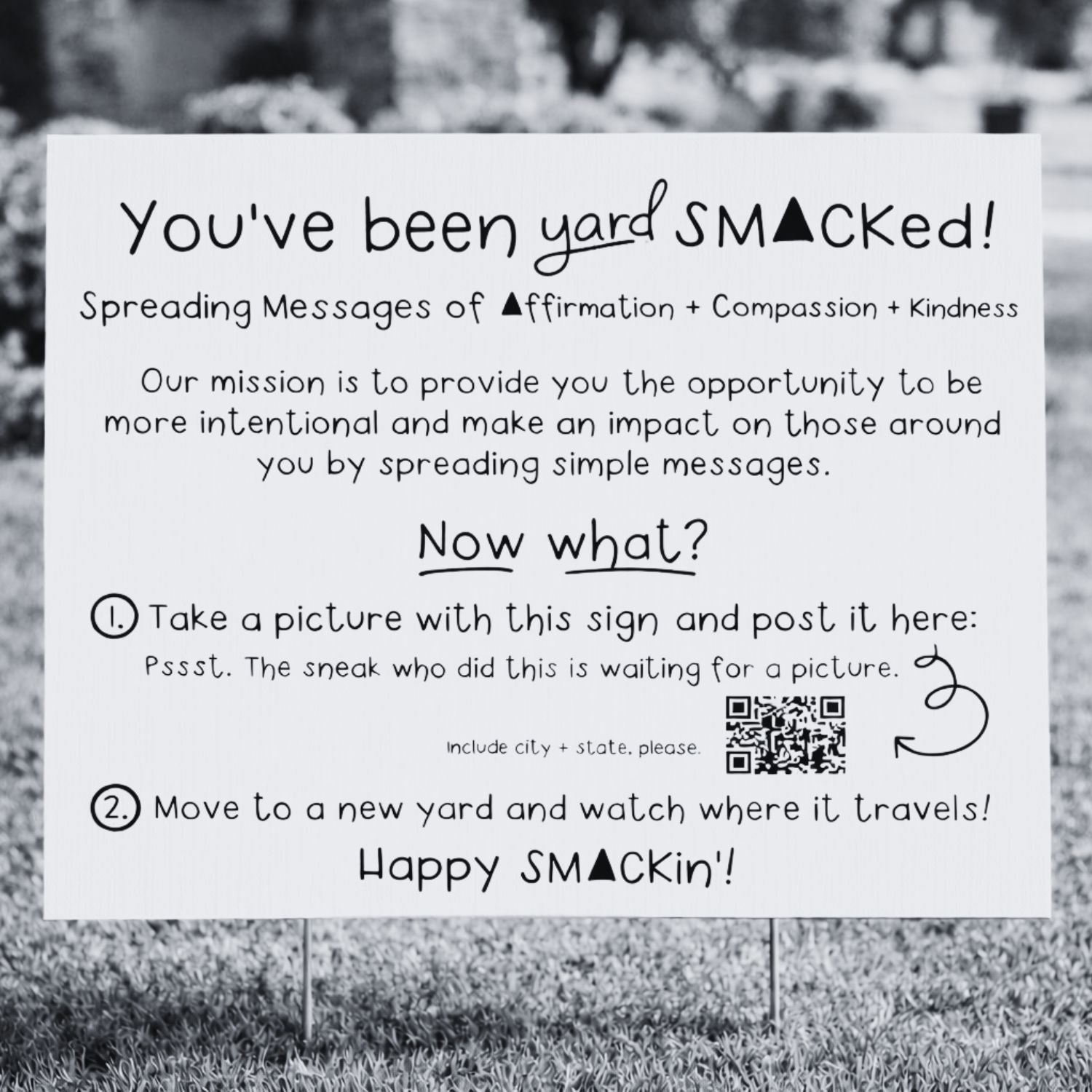 We’ve taken SMACK to the next level—Yard SMACKing! This set includes 10 high-quality, 24"x18" weather-tolerant signs with EXTRA sturdy stakes and 10 unique SMACK sayings. Designed to travel from one yard to the next, each sign keeps our mission moving!